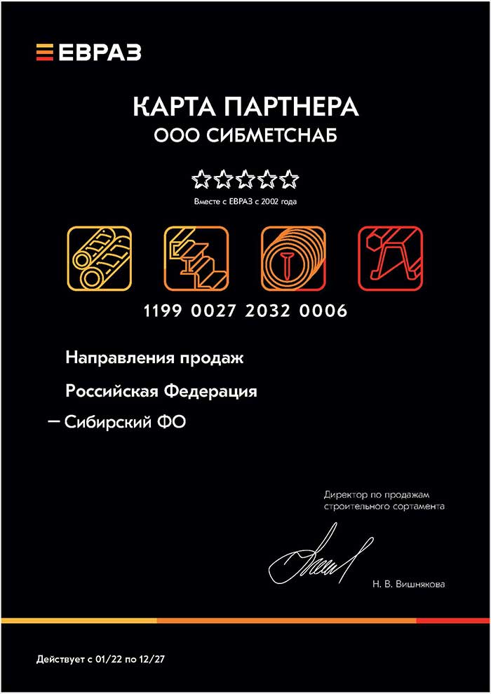 Выдан надежному партнеру и крупнейшему покупателю металлопродукции.